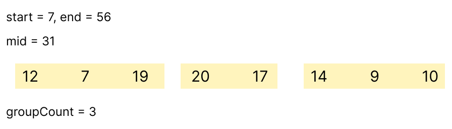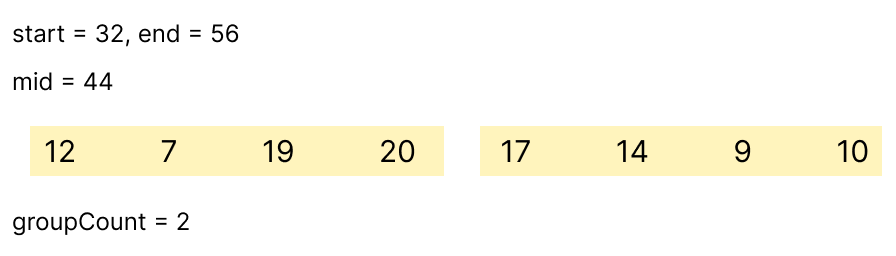 2. `start`는 출발지점인 `0`, `end`는 도착지점인 `d`로 초기화시킨 후 이분탐색을 진행한다.